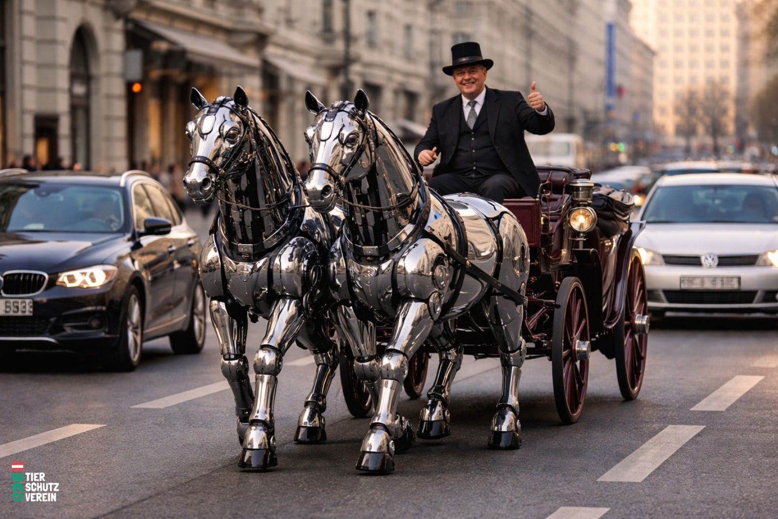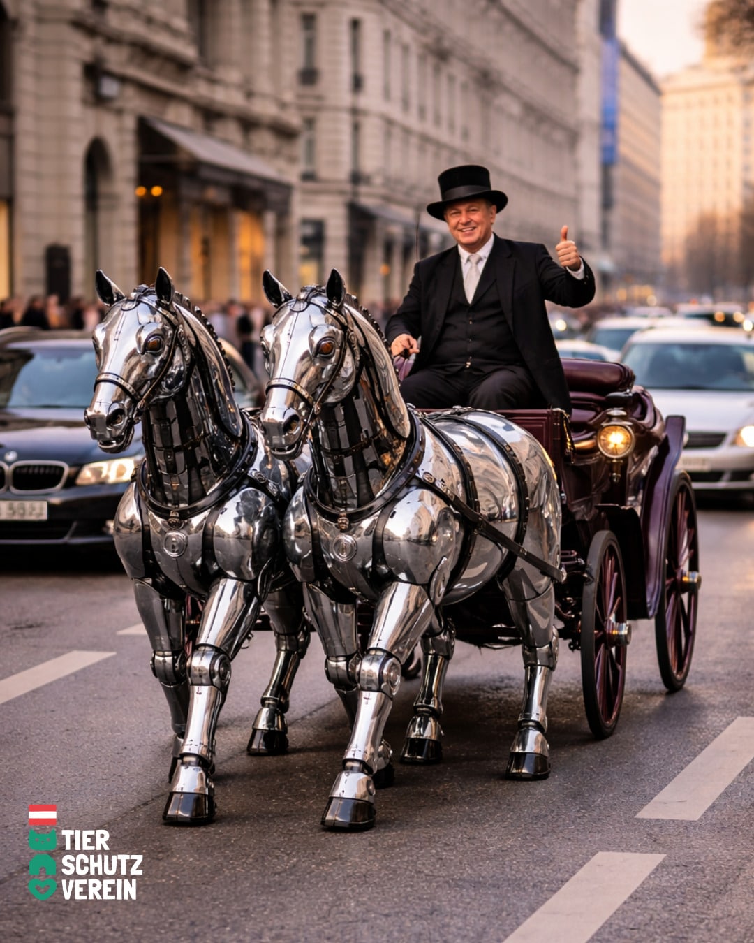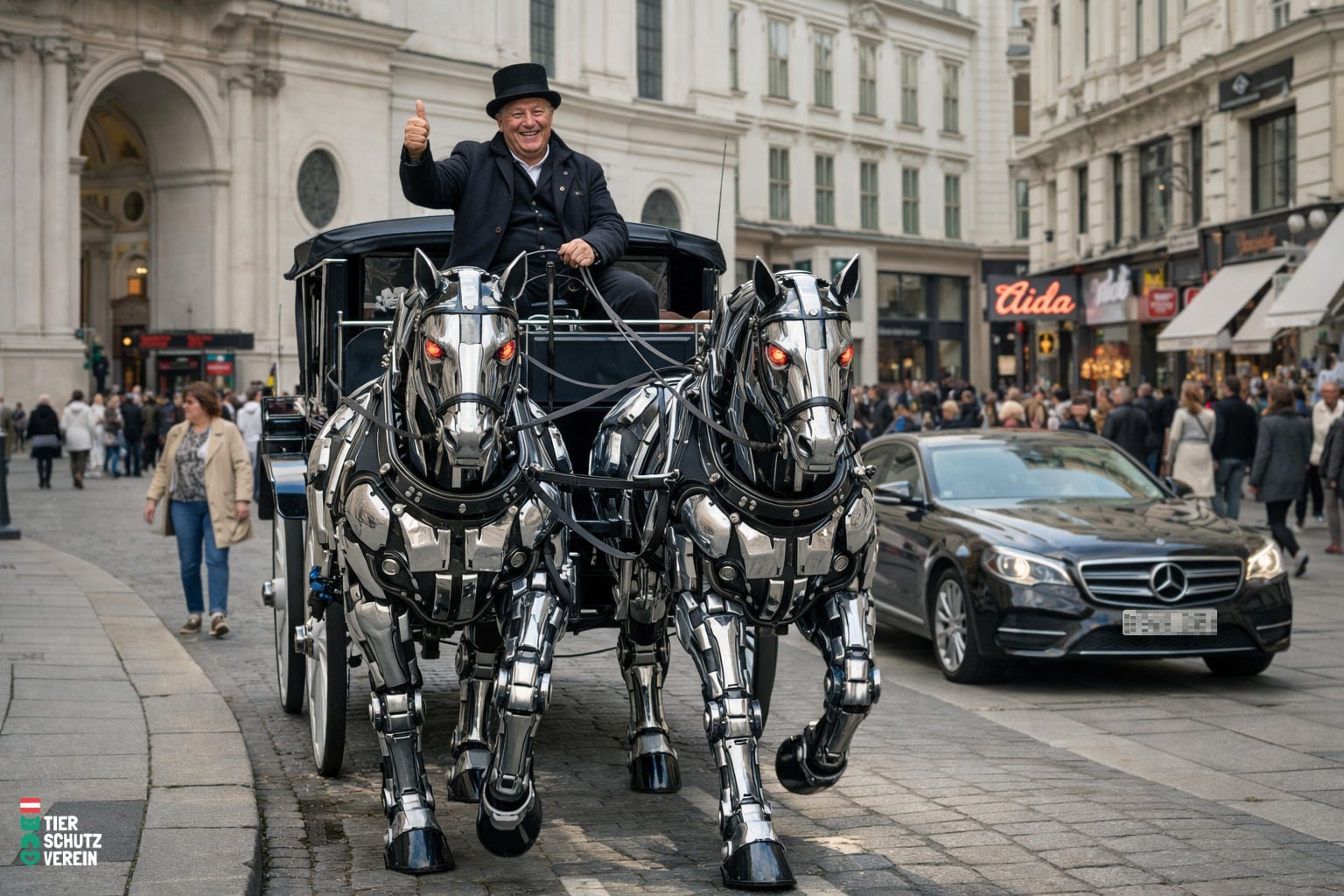 OTS (Wien) 1. 04. 2026 – Wien zieht jetzt die Reißleine beim Thema Fiaker. Nachdem im März ein Pferd auf offener Straße zusammenbrach und eingeschläfert werden musste, präsentiert die Stadt heute das neue Fiakermodell F1000: halb Tier, halb Maschine, unterstützt durch 100 Prozent KI (Künstliche Inszenierung).