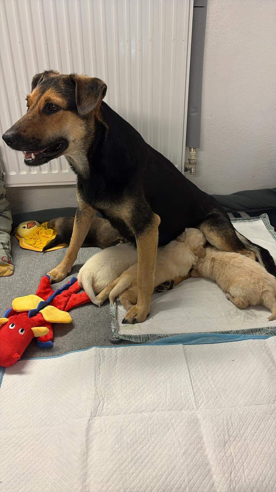 Mutterhündin Mila, sie ist vermutlich vier bis fünf Jahre, steht weiterhin unter tierärztlicher Beobachtung. Sie leidet an den Folgen ihres starken Parasitenbefalls und zeigt nun auch Blut im Kot – ein ernstes Warnsignal, das derzeit medizinisch abgeklärt wird.