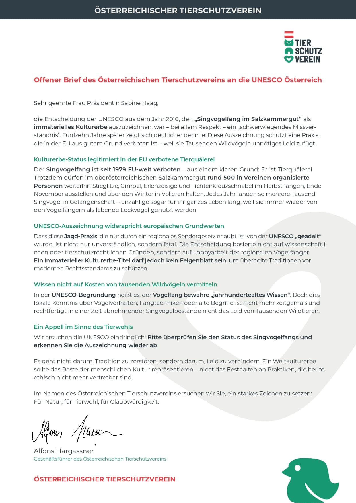 Österreichischer Tierschutzverein: Offener Brief an UNESCO